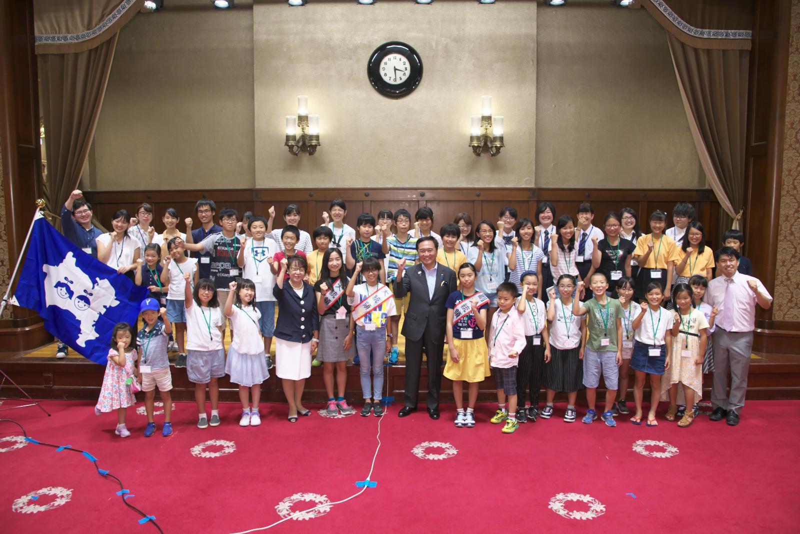 2018年8月20日(月)に神奈川県庁本庁舎大会議場で第2回かながわ子ども合衆国サミットが開催されました。子どもたちによるパワーあふれる「かながわ子ども合衆国の国歌」の合唱と溝口大統領による堂々とした開会宣言でスタートしました。