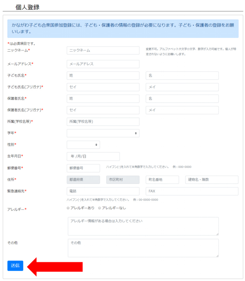 ※複数のお子様(兄弟姉妹等)のお申込みをされる場合は、それぞれ個人登録が必要になります。同じニックネームを使用しての登録はできません。 (既に使用されているニックネームでの登録不可)
