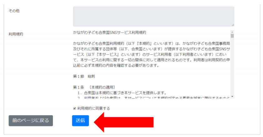 3.入力内容の確認と、利用規約が表示されます。「□利用規約に同意する」にチェックを入れ、「送信」ボタンをクリック