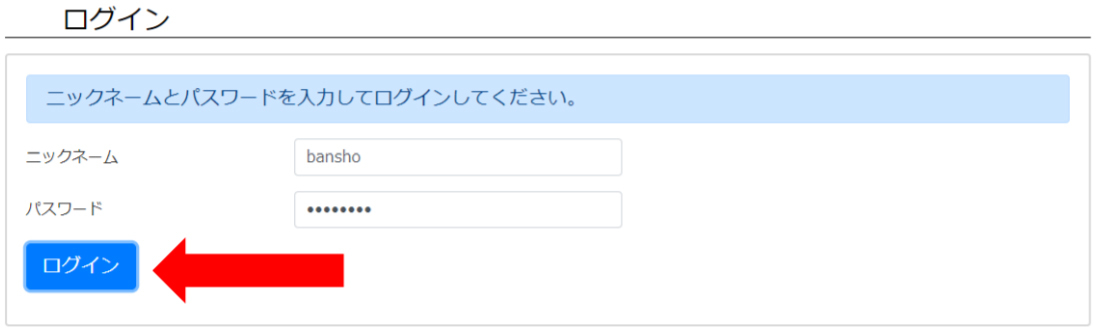 3. 会員登録時に利用したニックネームとパスワードを入力し、ログインボタンをクリック