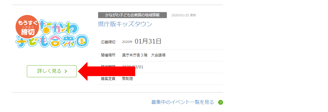 9.トップページを下方向にスクロールすると、募集中のイベントが表示されます。「詳しく見る」ボタンをクリック