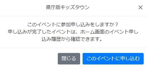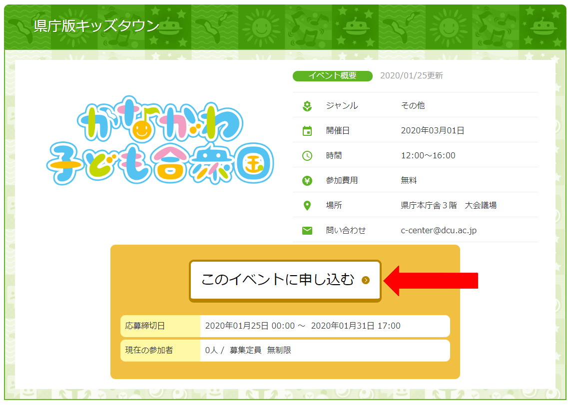 10.県庁ミニキッズタウンの詳細情報が表示されます。「このイベントに申し込む」ボタンをクリック