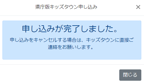 12.以上で、申し込みが完了です。申し込みをキャンセルする場合は、かながわ子ども合衆国事務局まで、メール(c-center@dcu.ac.jp)にてご連絡ください。 (件名:県庁ミニキッズタウンのキャンセルについて 本文:氏名、ニックネーム)