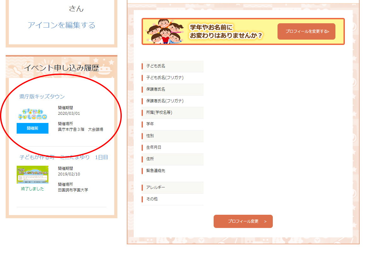 4. 下の画像は、ログインした際の最初の画面です。赤丸の部分に画像のようにイベント申込み履歴があれば、申込みが完了しています。