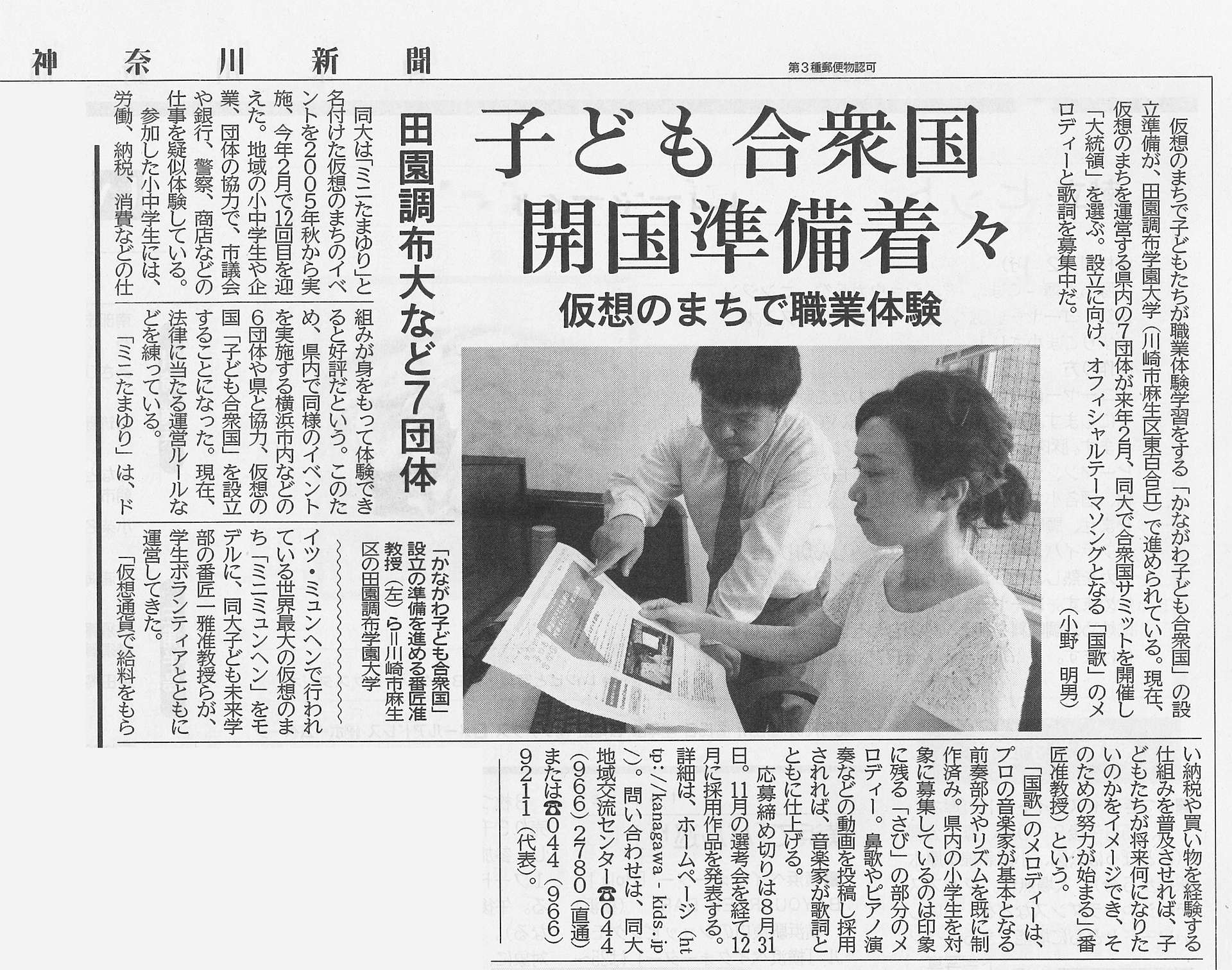 大統領の溝口さんは「かながわ子ども合衆国マルシェをやってみたい。そのマルシェでお互いのまちの交流をして、他のまちのいいところを取り入れ神奈川県のキッズタウンをもっとよくできたらいいなと思う。また、キッズタウンはまだまだ神奈川県のこどもたちや大人たちに知られていないので、神奈川県のたよりなどで、キッズタウン開催のお知らせを扱い、多くのキッズタウンに県知事をはじめ県の人たちに来て関心を持っていただき、多くの人に注目してもらうきっかけにしたい」と 黒岩知事の前で決意を表明しました。